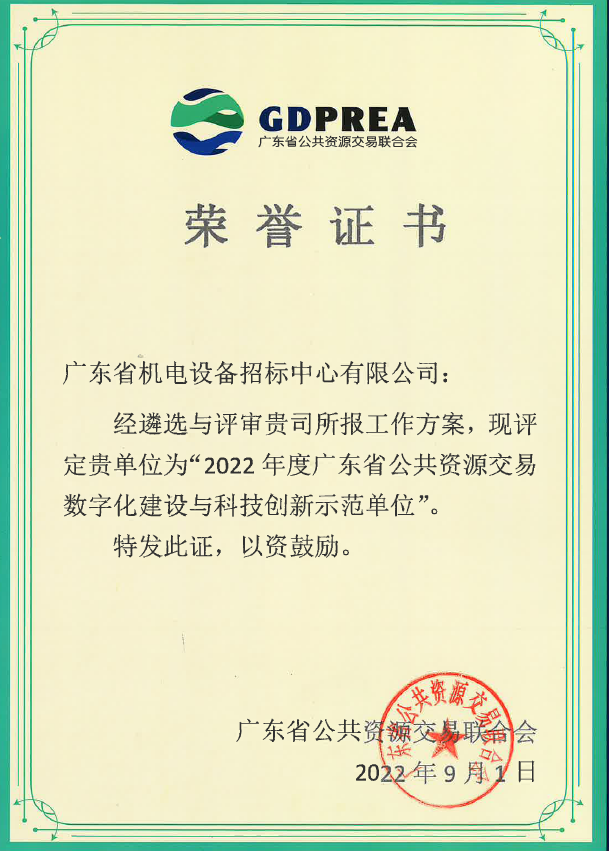 近日,B体育网页版页面登录_B体育(中国)(以下简称招标中心)被评为“广东省公共资源交易数字化建设与科技创新示范单位”。