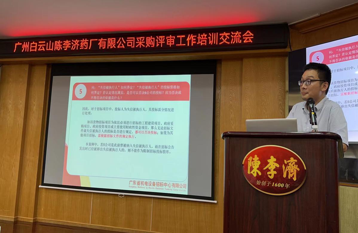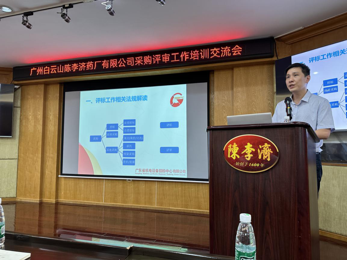 9月14日下午,招标中心受邀到陈李济药厂进行采购评审工作培训交流。此次授课由招标中心招标二部部长兼电子商务部部长叶耀华、招标二部业务员谢亚卫作为主讲人,主讲人就评标工作相关法规和实务操作、不同的评标办法与重难点,以及在评标过程中需要注意和规避的风险等内容进行了解读和分享,进一步提升相关方业务水平和风险防范能力。