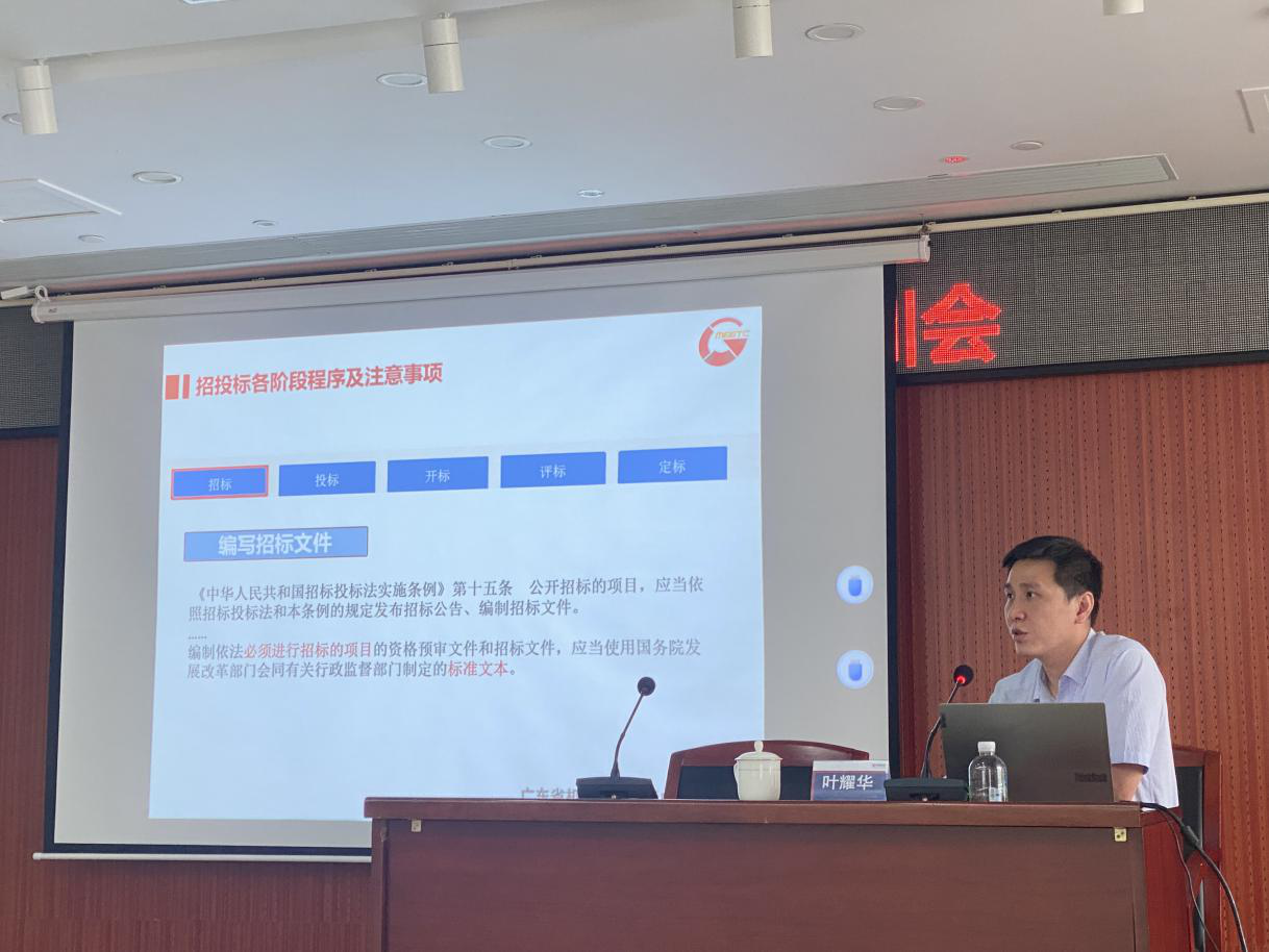 8月16日上午,招标中心受邀到广东建科院开展招投标知识培训交流会。此次培训由招标中心招标四部部长陈芳作为主讲人,就投标相关的法律体系架构、招投标的相关采购方式、第三方检测项目有关招投标情况以及投标的注意事项进行解读和分享,参加讲座的人员针对热点、疑点及难点问题与主讲人积极互动。