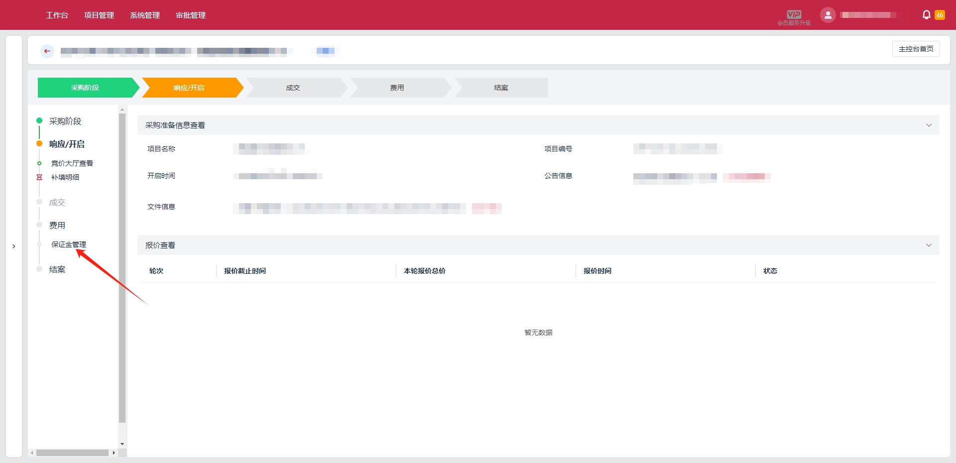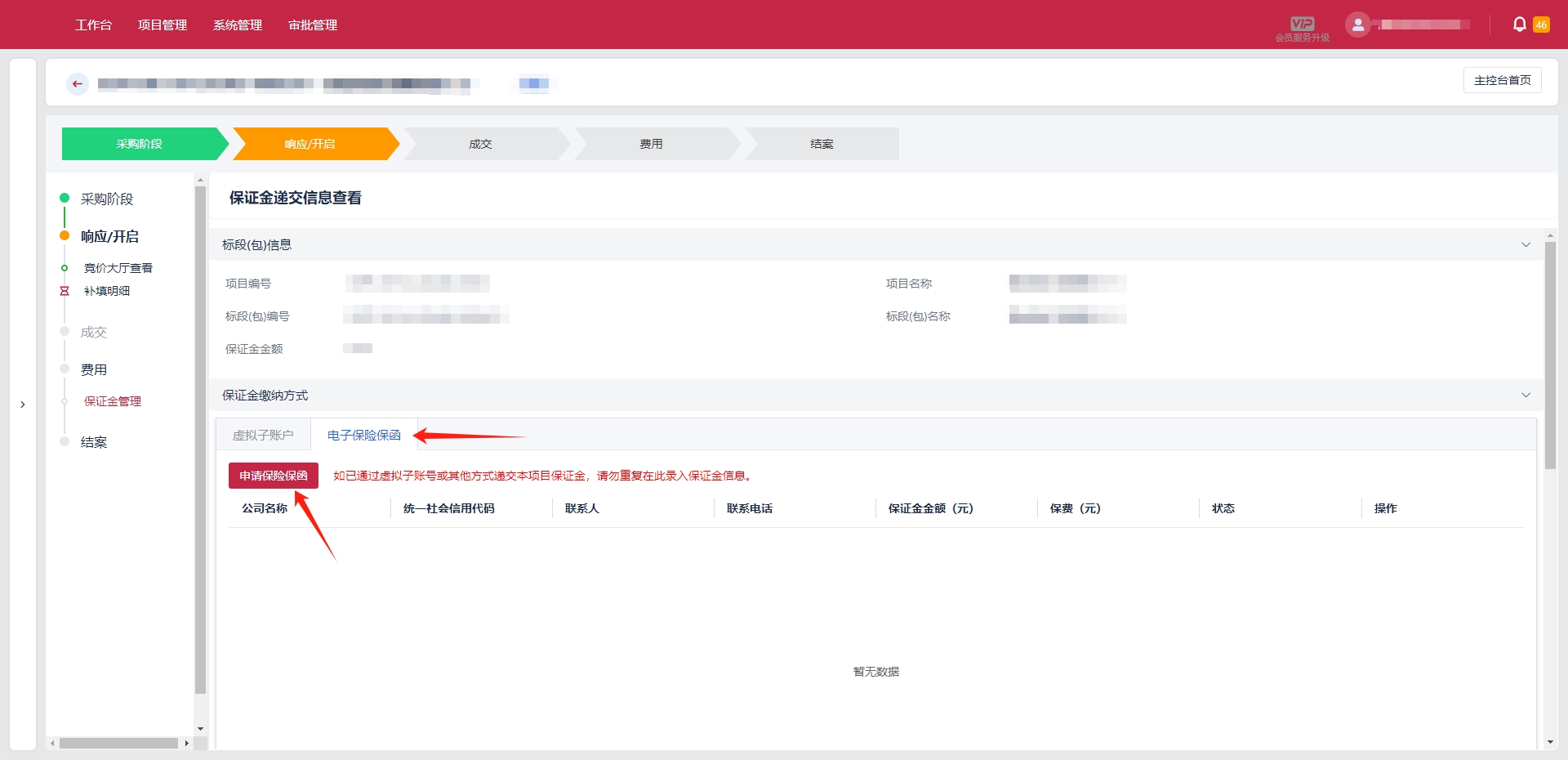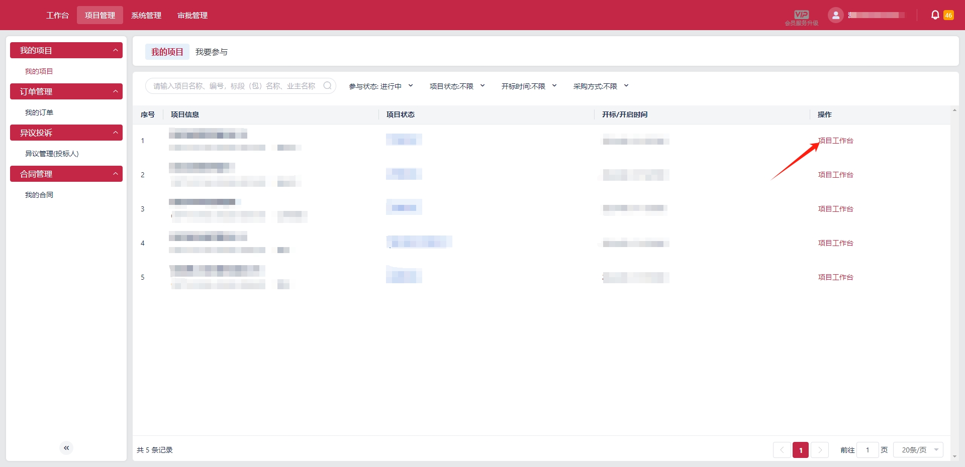 1、点击网址:http://gmeetc.gdebidding.com/ebidding/#/login,登录广东省机电设备招标中心电子交易平台2.0,点击“项目管理-我的项目”,选择需要申请电子保函的项目,点击“项目工作台”