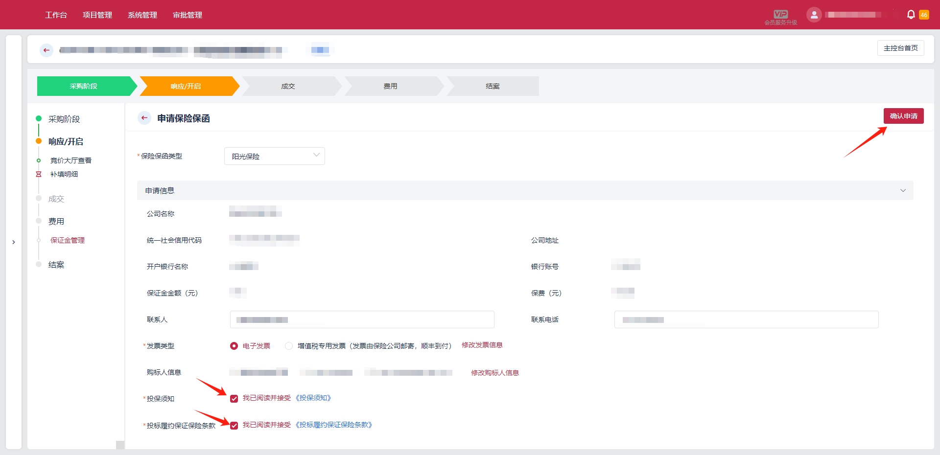 4、确认电子保函申请信息无误后勾选接受《投保须知》、《投标履约保证保险条款》,点击右上角“确认申请”按钮后弹出支付链接,用电脑浏览器打开支付链接,支付成功后回到申请界面下载电子保函及电子发票文件